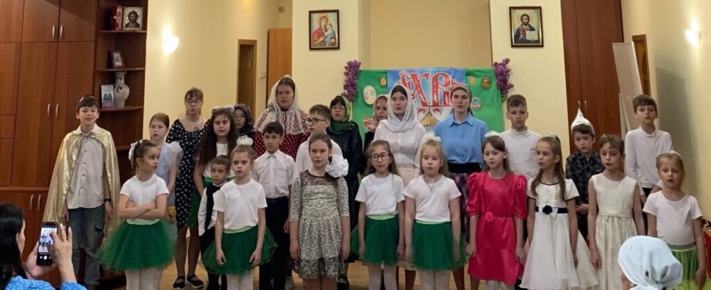 Звучали замечательные стихи, песни и церковные песнопения, разыгрывались сюжеты библейской истории, связанные с воскресением Христа и бесконечно любящими его Женами-мироносицами. Дети порадовали и двумя музыкальными произведениями, сыгранными на народных инструментах.